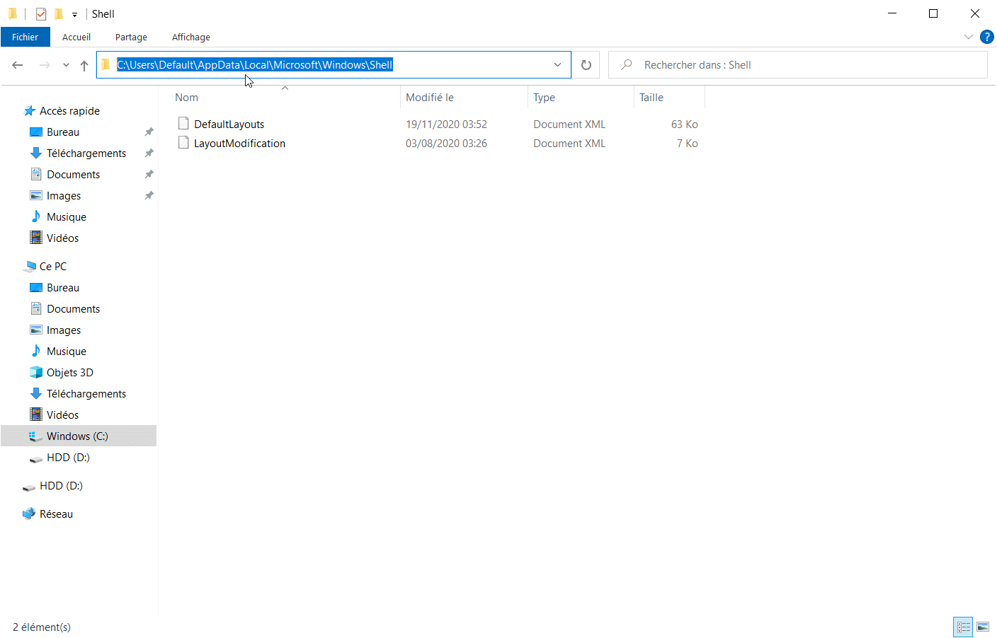 C:\Users\Default\AppData\Local\Microsoft\Windows\Shell - Ouvrez le fichier nommé