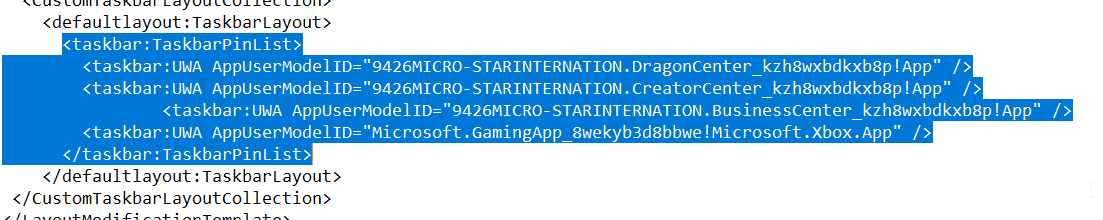 LayoutModification.xmlet cherchez la balise<taskbar:TaskbarPinList>à la fin du document. - Supprimez les lignes entre les deux balises :