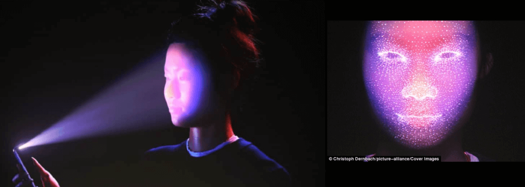 Le projecteur de points envoie plus de 30 000 points invisibles sur votre visage. Il fabrique ensuite une carte 3D de votre visage, celle-ci sera lu par la caméra infrarouge.