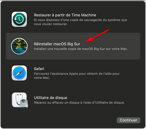 - Cliquez sur Options > Continuer et Réinstaller macOS, la nouvelle version vous sera automatiquement proposée.