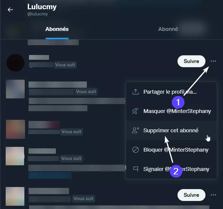 Pour enlever un abonné, cliquez sur les trois points sur son profil, puis dans le menu sélectionnez « Supprimer cet abonné ».