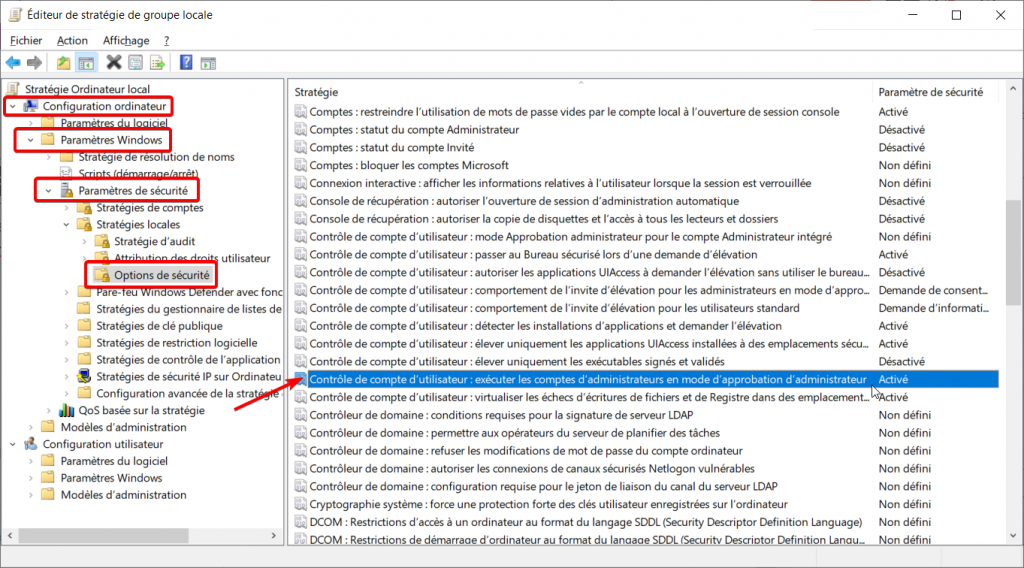 - Trouvez la ligne « Contrôle de compte d’utilisateur : Exécuter les comptes d’administrateurs en mode d’approbation d’administration » et faites un clic-droit.