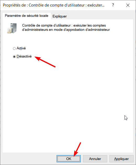 Ce problème peut être causé par un niveau de sécurité et d’alerte trop haut appliqué à votre compte Windows, il peut être nécessaire d’abaisser ce niveau.
